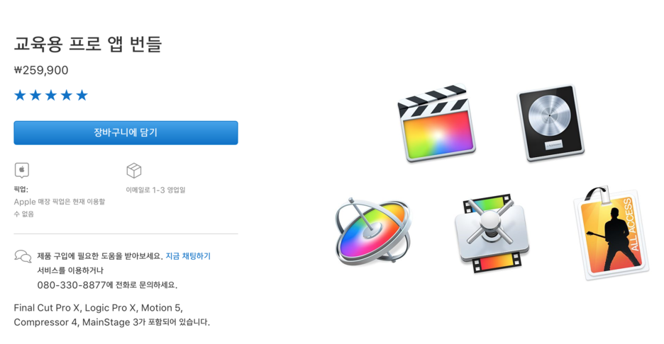 이건 진짜 유용한 방법인데 문제가 된다면 이 글을 지워야겠지..? 뭐 불법으로 다운 받으면 파컷도 무료이긴 하다만 그게 아니라 합법적으로 사는 방법이다. 일단 교육용 프로 앱 번들은Final Cut Pro X, Logic Pro X, Motion 5, Compressor 4, MainStage 3요 5가지 앱들을 다 포함한 번들 앱이다.