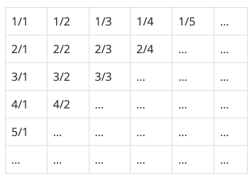 이와 같이 나열된 분수들을 1/1 → 1/2 → 2/1 → 3/1 → 2/2 → … 과 같은 지그재그 순서로