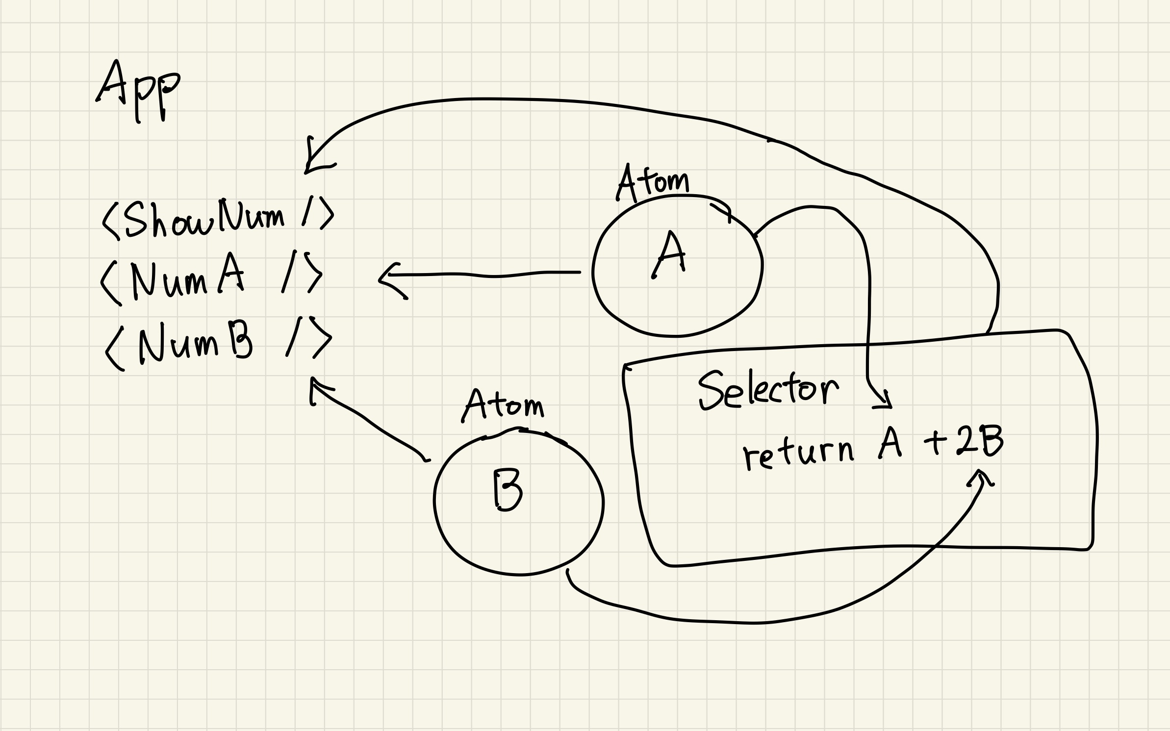 그림보면 알 수 있듯이 사실 되게 단순한 구조이다. 각각의 atom들을 get method로 구독할 수 있고 구독된 state들이 변화될 때마다 selector도 변화 감지 후의 결과값을 반환해준다.