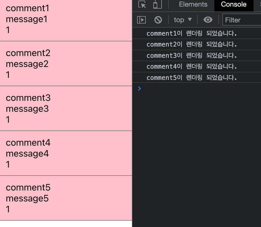 실행을 시켜보면 왼쪽 commentList가 기본으로 렌더링 되고 아래 하나씩 추가되는 것을 확인할 수 있다.