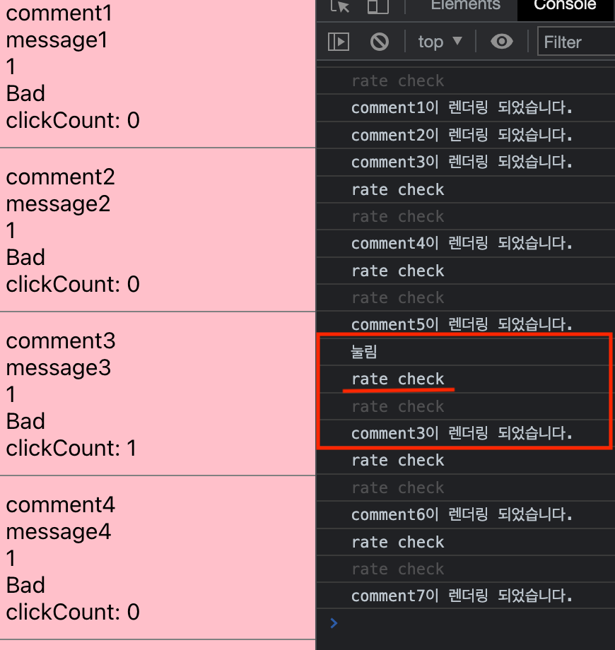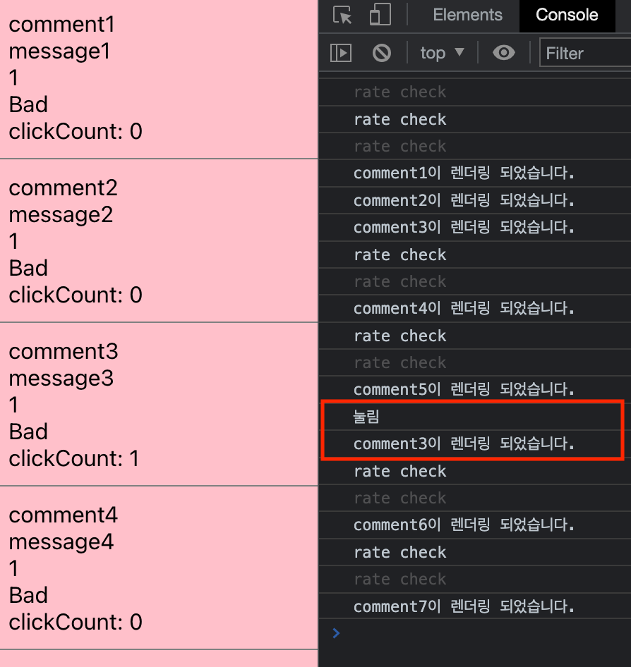 위에서도 설명했듯이 자기자신이 눌렸으니까 리렌더링은 OK. 하지만 이번엔 rateCheck를 하지 않는 것을 볼 수 있다.
