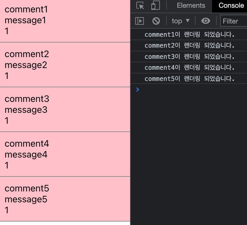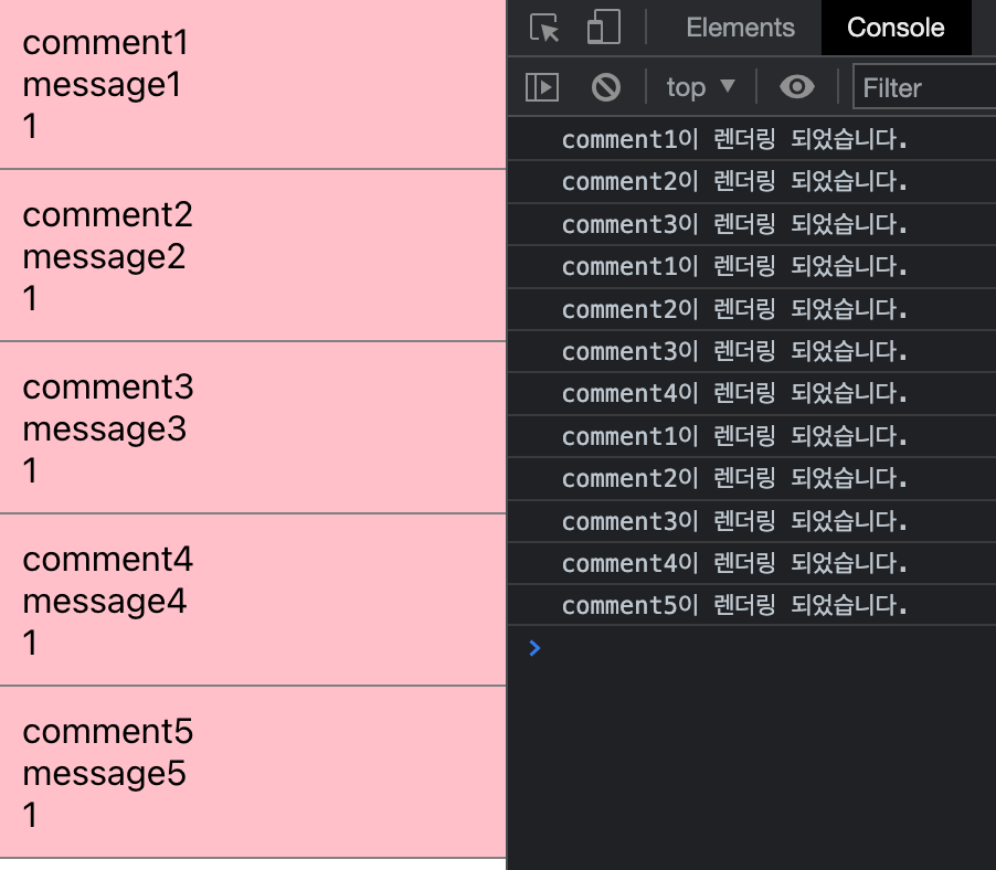 로그 순서를 보면 123 → 1234 → 12345 이렇게 나오는 것을 확인할 수 있다. commentItem 하나가 추가될 때마다 commentList 전부를 다시 렌더링하는 상황이다. 무척이나 비효율적인 것을 확인할 수 있다.