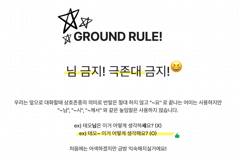 이런 식으로 ‘님’자를 안 붙이고 질문하는 사람들이 있었다. 처음에 뭔가 했다. 친군가..? 원래 아는 사람인가..? 아마 질문자는 스프린트 참여자였음에 틀림없다. 테오의 스프린트를 진행할 때 그라운드룰이 있는데 아래와 같다.
