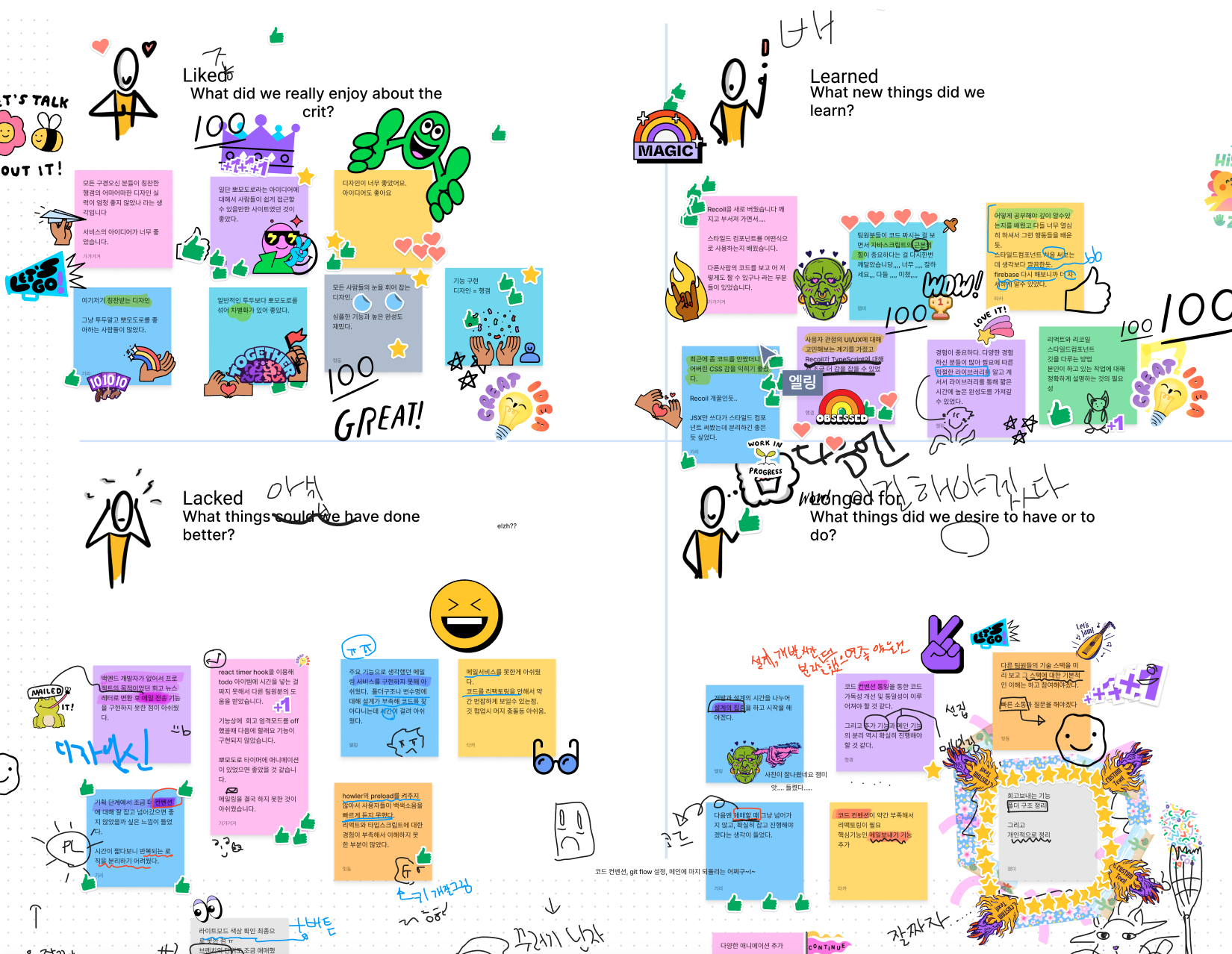 다음 번에는 주도적으로 리딩 해 보고 싶다. 물론 이번 스프린트에서도 어느정도 주도적으로 하려고 노력했다. 어떤 기술 스택을 쓸지.. 뭐뭐 써봤고 내가 그 부분 담당하겠다 먼저 얘기도 하고 등등.. 하지만 팀 리딩은 차원이 다른 문제 같다. 다들 얘기하는게 너무 자연스럽고 음… 하여튼 아직 배울점이 산더미다..!