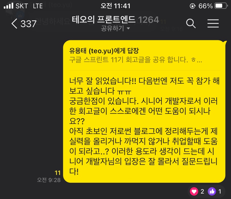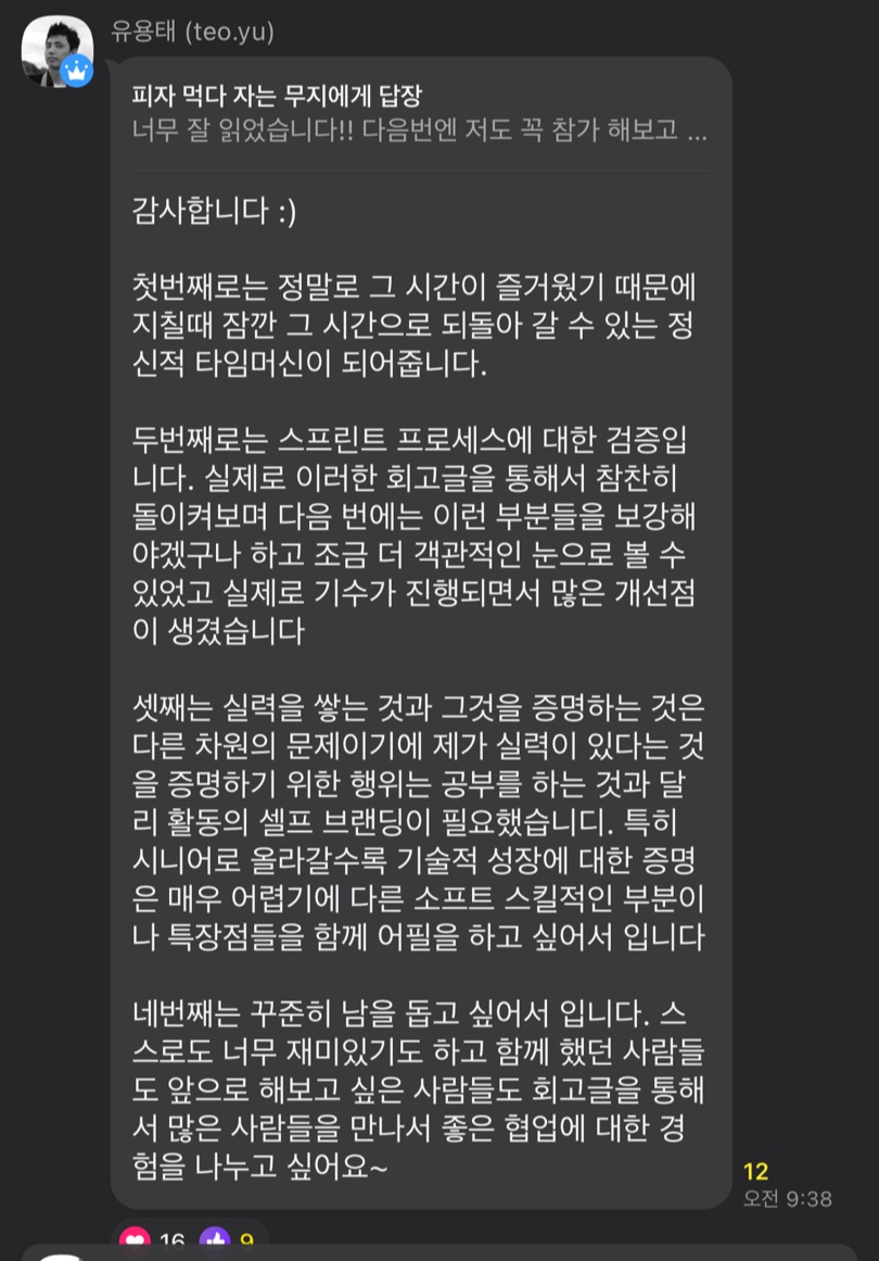 이 후기 처음에 ‘10기 신청은 아직 실력이 부족하다는 판단을 했었고’ 라고 적었었다. 이 당시에는 리액트를 막 공부한 상태라 들어가면 민폐만 끼칠 것 같았다. 우리 팀에 힛동이 딱 그때의 나와 같은 상황이었다. 그렇지만 힛동은 용기내어 스프린트를 신청했고 너무 열심히 자기가 할 수 있는 것들을 잘 해 내었다. 나도 10기 신청을 했었다면 지금쯤 좀 더 잘 할 수 있지 않았을까 하는 아쉬움이 남았다.