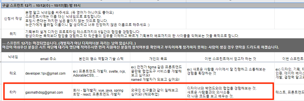 본격적으로 후기를 작성해보려 한다. 스프린트가 어떻게 흘러가지는 아주 자세히 알고 싶으면 https://velog.io/@teo/google-sprint-12 테오님의 블로그에 잘 나와있다. 여긴 내 블로그니까 내가 스프린트에 대해 쓰고 싶은 후기를 적어본다.