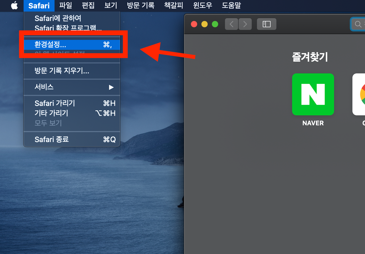 2. 왼쪽 상단 Safari -> 환경설정 클릭. 영어로 preference 뭐시기일듯;;