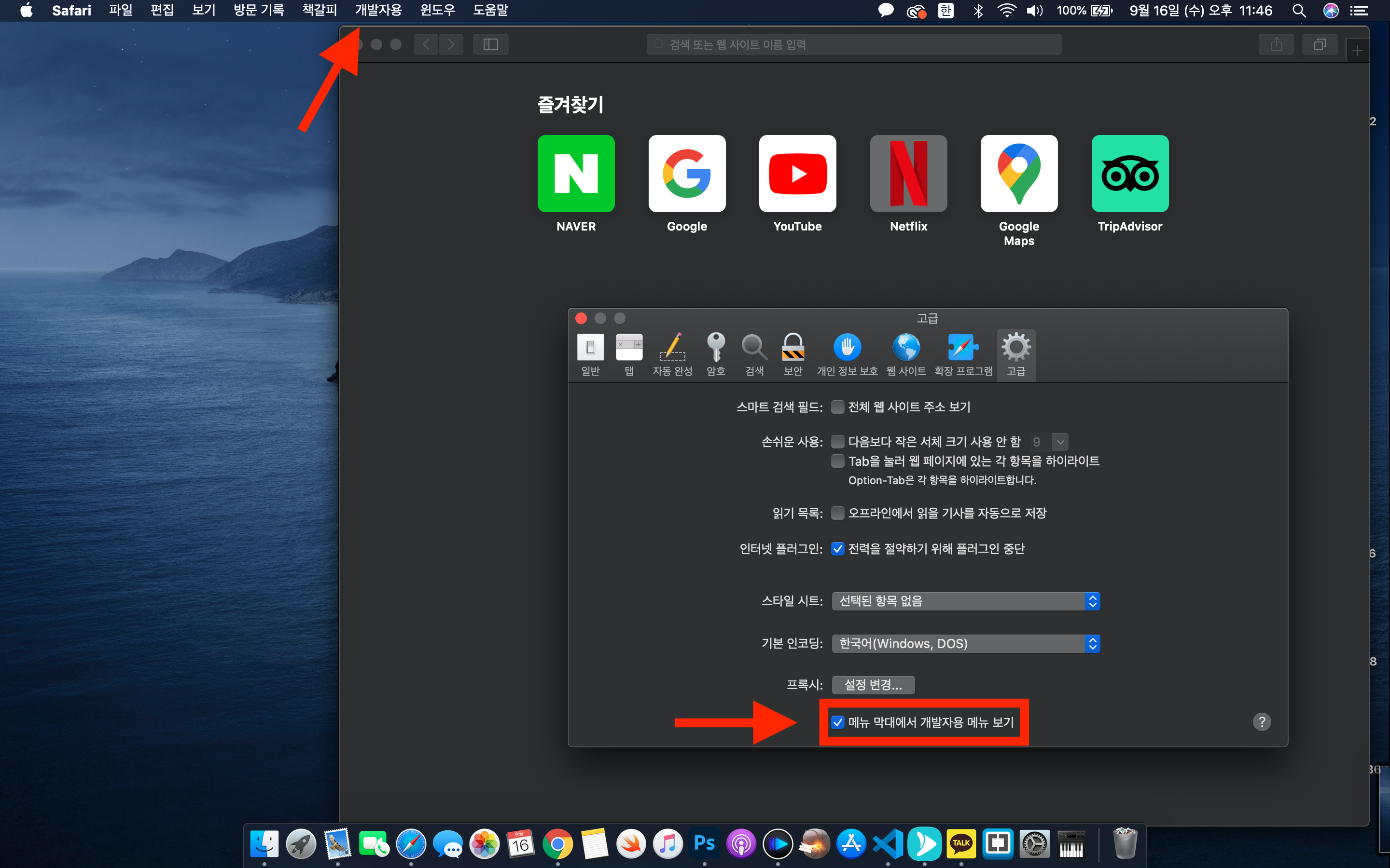 4. 하단 메뉴막대에서 개발자용 메뉴 보기 클릭. 영어버전은 맨 아래꺼 누르면 됨. 그럼 상단 메뉴 막대에 개발자용 이라고 생김.