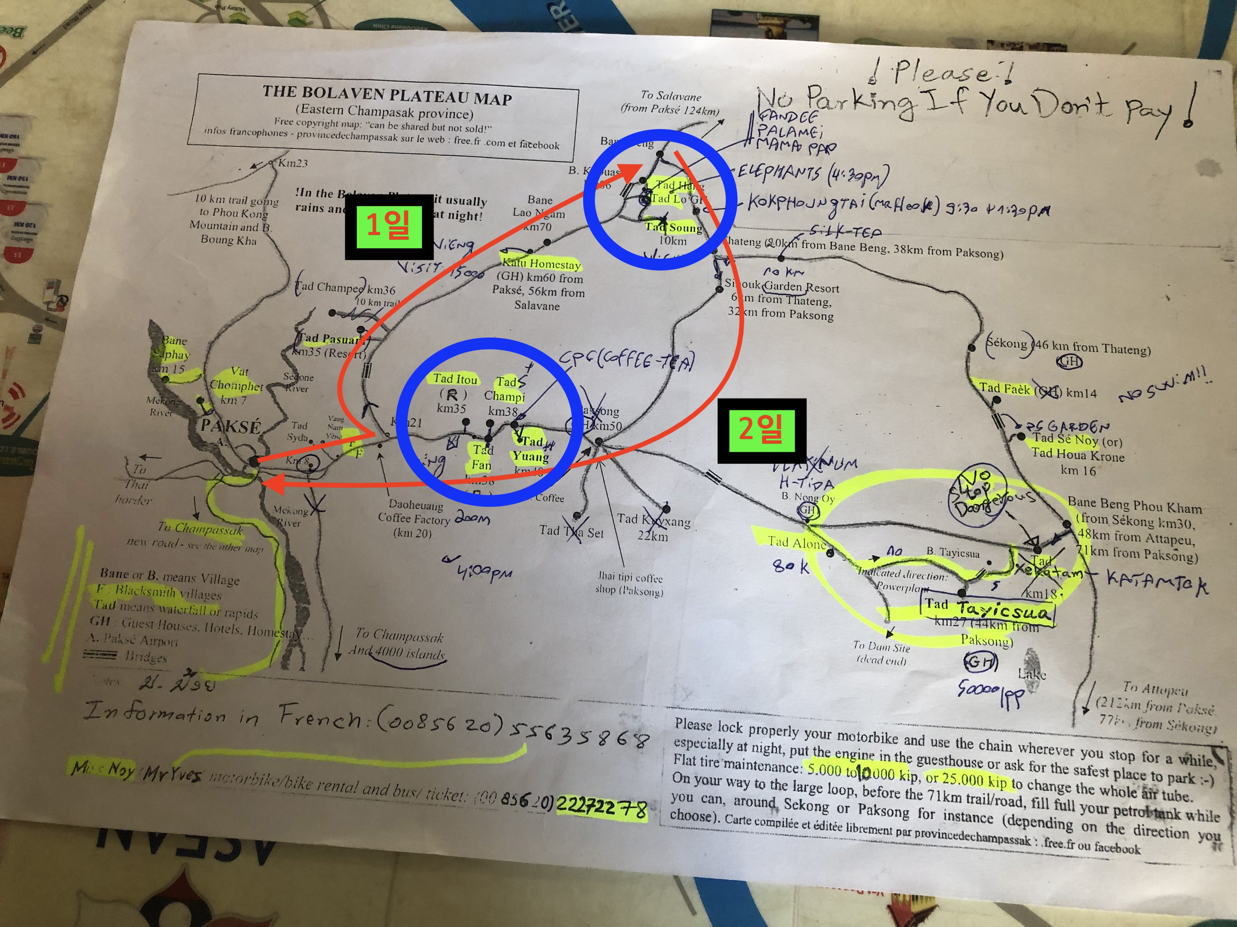 볼라벤 루프의 전체 지도다. 작은 루프 큰 루프가 있는데 큰 루프는 베트남 하장 루프의 길이 정도 되고 작은 루프는 1박 2일 코스? 하장에서 이미 3박 4일 빡시게 달렸던 것도 있고 방비엥 가는 날짜도 맞춰야 해서 작은 루프로 결정! 팍세는 폭포의 도시다. 위 지도에 Tad 이 라오스 말로 폭포라는 뜻이다. 내가 가는 작을 루프만 해도 7개의 폭포가 있고 큰 루프까지 포함하면 대략 15개정도 되는 듯하다.
