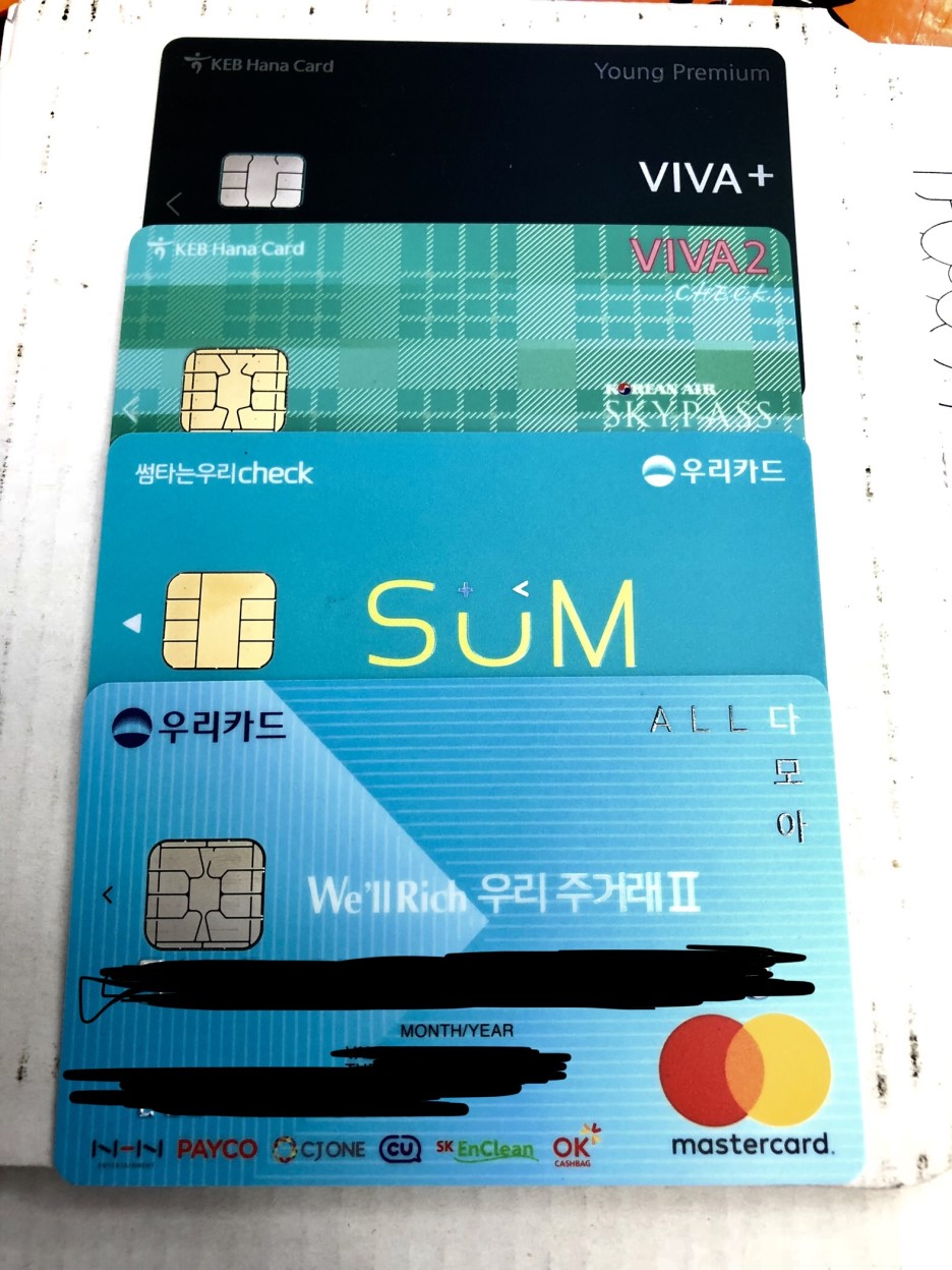 내가 발급 받은 카드는 우리 썸(master card), 우리 원(BC), 하나 비바플러스(VISA), 하나 비바2(VISA)이렇게 총 4개다. 구구절절하게 연회비 얼마니 수수료얼마니 이런거 안 올릴거다. 왜냐면 난 봐도 모르거든..;; 사실 읽어도 뭔소린지 몰라서 그냥 사람들이 좋다는 거를 발급 받았지 정확히 뭐가 좋은지는 모른다. ㅋㅋ