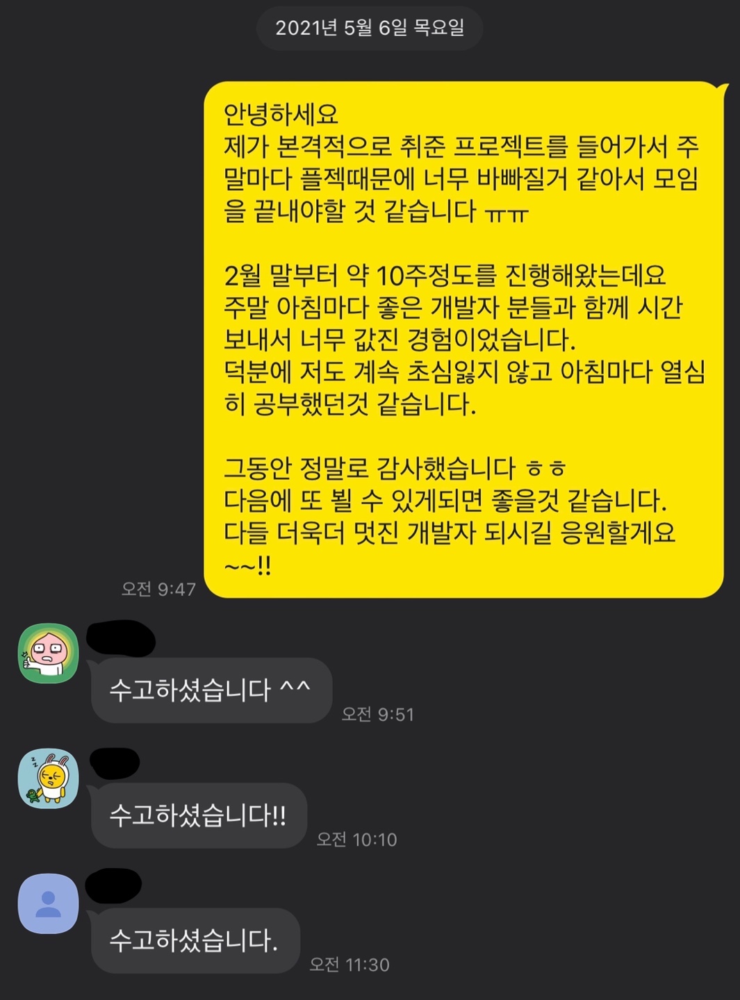 학원에서 이제 마지막 프로젝트를 들어갔고 정말로 여기에 올인할 때가 와서 그만두게 되었다. 모각코라서 딱히 막 뭔가를 교류한다거나 하지는 않았지만 그래도 현재 현업자분들도 매주 아침마다 열공하는 모습을 보면서 초심 잃지 않고 나도 같이 열심히 했던것 같다.