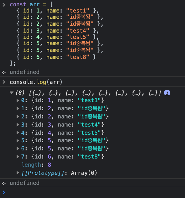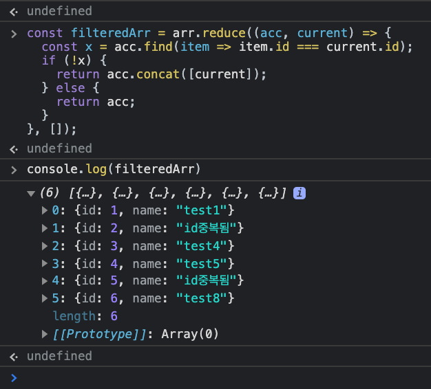 reduce를 사용해서 코드 작성 후 새로운 변수에 저장하면 아래와 같이 배열 내 중복된 객체들은 제거됨!