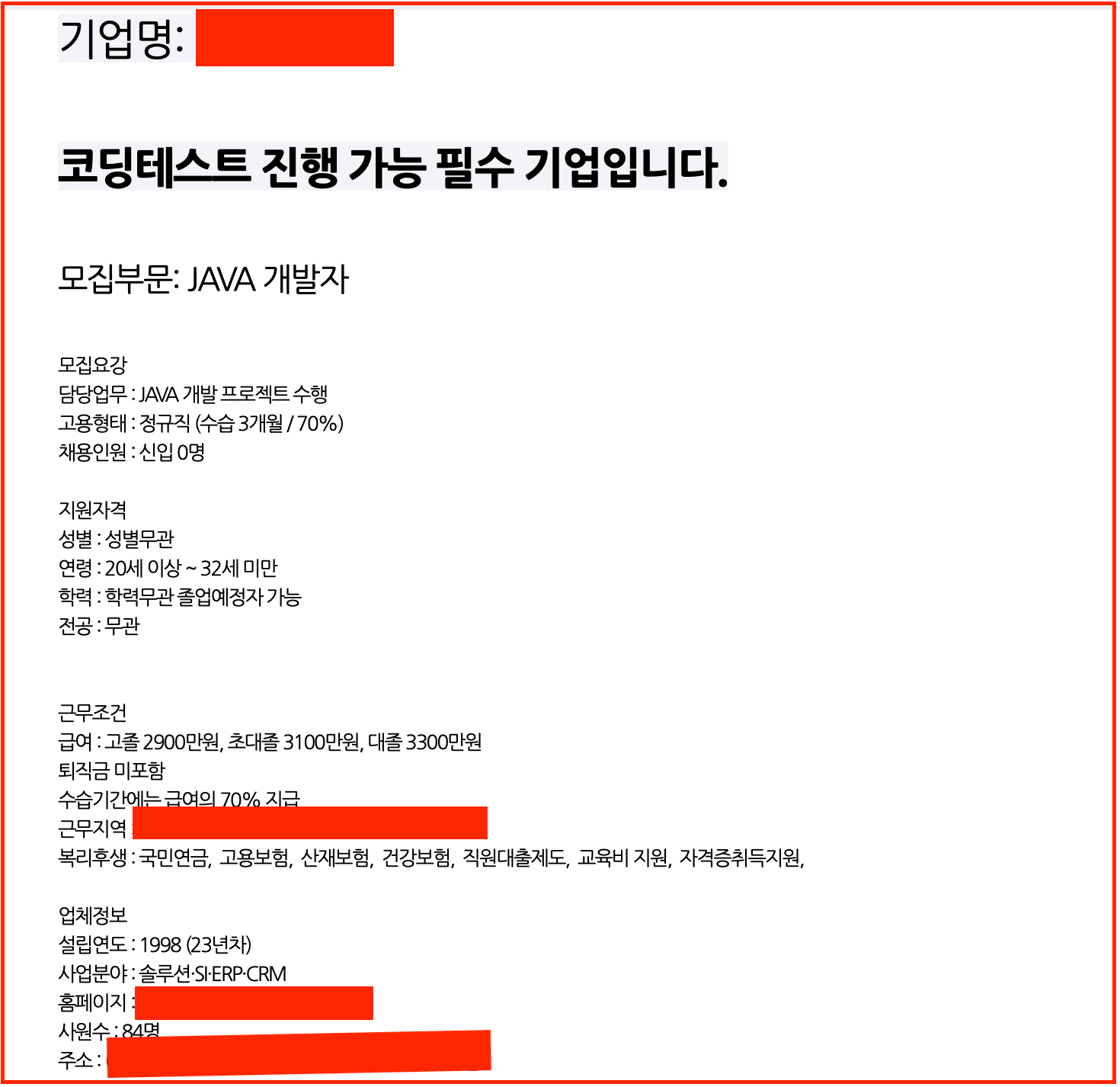 내가 받은 곳 중 가장 좋은 곳이다. 코딩테스트를 본다는 것은 기본적으로 실력을 보고 뽑는다는 소리다. 뭐 요즘은 좋소기업도 본다고는 하지만 여기는 연봉도 높고 나름 체계적인거 같고 무엇보다 정상적인!? SI업체라는점..? 여기는 가보고 싶었지만 서류 탈락했다.. 하하;; 잡플래닛 후기는 2.3 (리뷰 100) -> 장점 : 초봉이 쎈 편, 개발로 배울점이 좀 있다 // 단점 : 꼰대기질..?