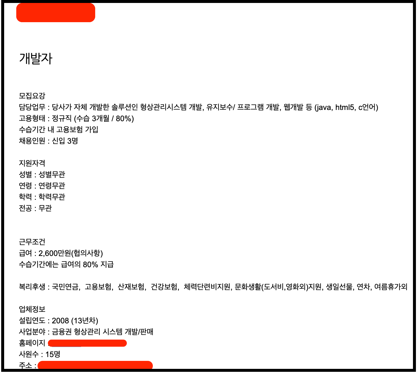 연봉만 봤을땐 최악인 회사였다. 내가 이 이메일을 봤을때 든 생각은 진짜 너무 고졸이라 개무시하는거 아닌가 싶었다. 2600에 수습기간 80%... 3개월 수습이라 치면 3개월동안은 2600*0.8 = 2080 -> 2080/12 = 174만원.. 세후로 대충 생각하면 150만원 언저리를 받을듯..? ㅋㅋ;; 근데 의외로 잡플래닛 후기는 3.2 (리뷰 9) -> 장점 : 사람들이 너무 좋다 // 단점 : 연봉이 너무 짜다